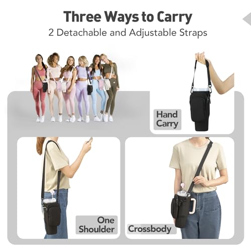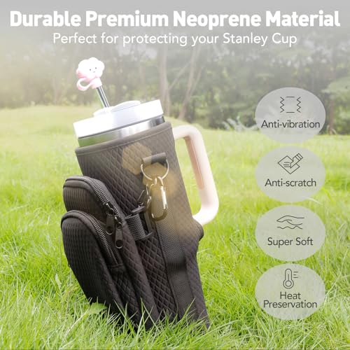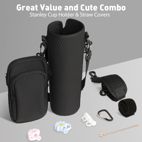 Stanley Cup Holder, 2024 Newest Stanley 40 Oz Cup Accessories, Include 3Pcs Straw Covers & Water Bottle Holder, 3D Embossing Neoprene Cup Carrier Bag & Case with 2 Straps and Phone Pocket(Black)